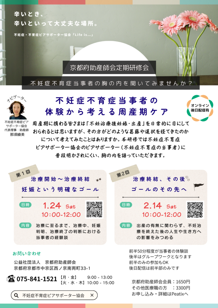 本研修では不妊症不育症ピアサポーター協会のピアサポーター(不妊症不育症の当事者)に普段明かされにくい、胸の内を語っていただきます。